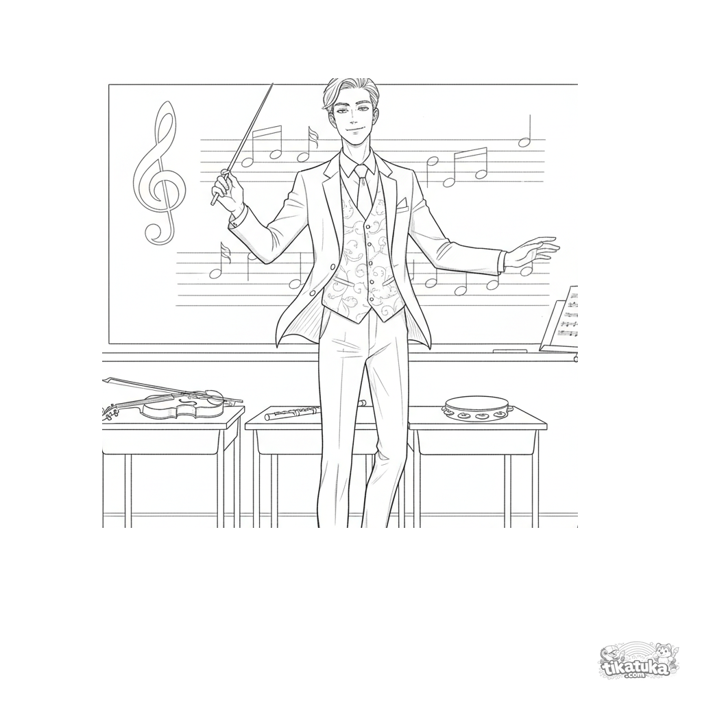 Página para colorir para crianças 10-12: um professor de música entusiasmado rege uma orquestra imaginária de instrumentos em uma sala com quadro de notas.