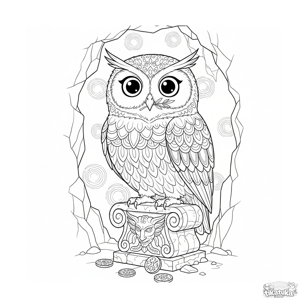 Página para colorir detalhada: uma coruja sábia, símbolo da deusa Atena, empoleirada em um pedestal de pedra no covil da Górgona. Para crianças de 10-12 anos.