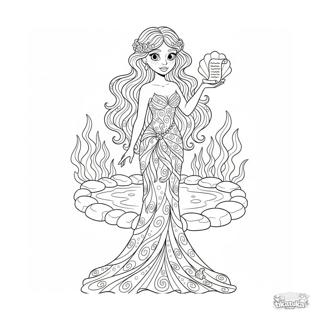 Página para colorir complexa estilo art nouveau: uma ninfa do mar Nereida entregando uma mensagem ao covil da Medusa.