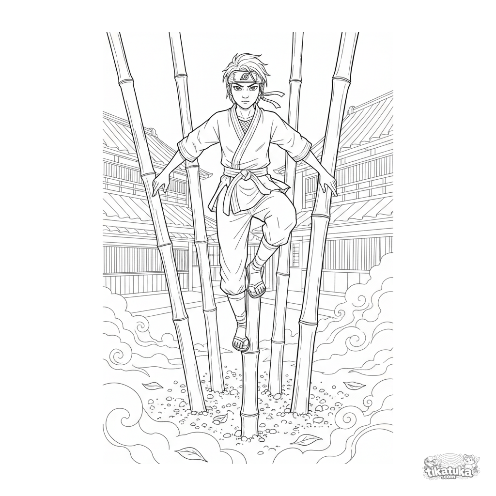 Página para colorir anime detalhada: um aprendiz de ninja pratica equilíbrio em altos postes de bambu em um pátio de treinamento tradicional. Cena complexa com arquitetura e atmosfera para 10-12 anos.