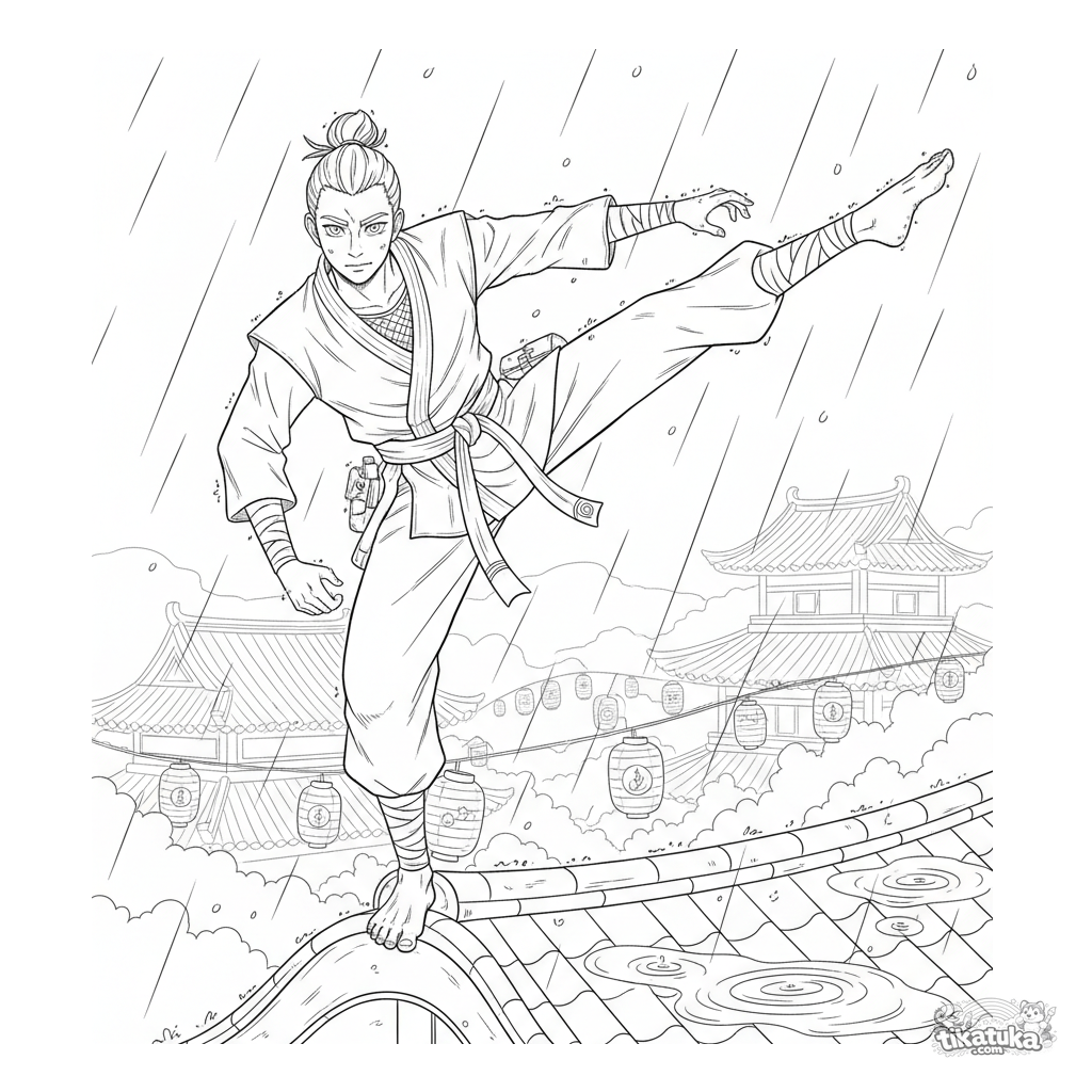 Página para colorir estilo anime complexa para 10-12 anos: um aprendiz de ninja demonstra equilíbrio na cumeeira escorregadia de um telhado durante um temporal na cidade noturna.