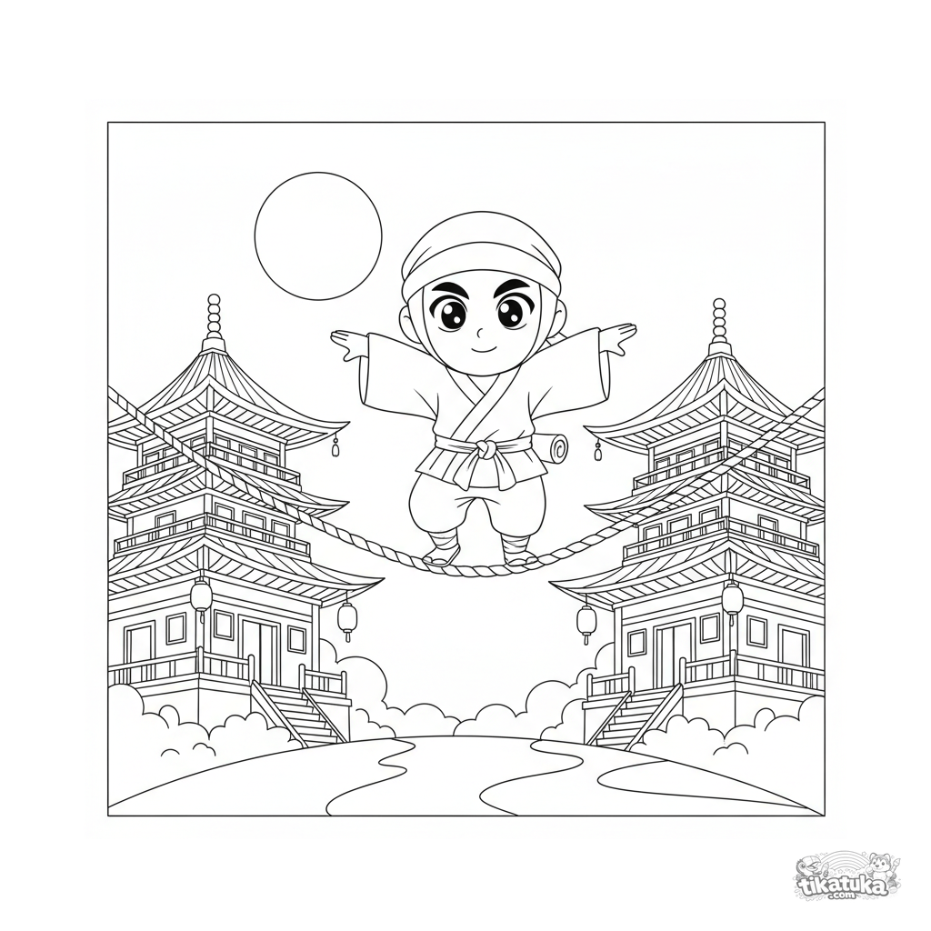 Página para colorir complexa de anime shonen: um estudante ninja se equilibra em uma corda entre telhados de pagode sob o luar, com um pergaminho no cinto.