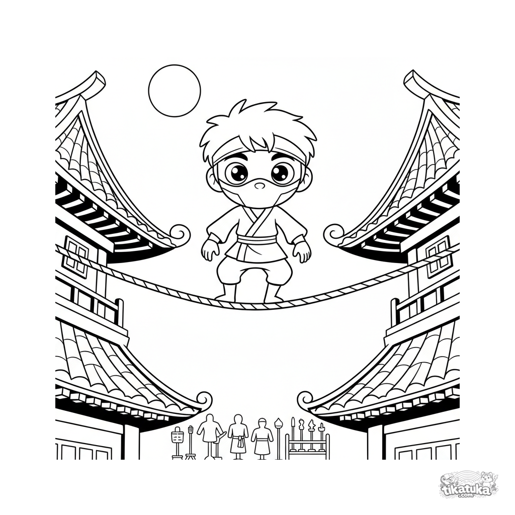 Emocionante página para colorir anime para 10-12 anos. Um estudante ninja realiza um difícil exercício de equilíbrio, caminhando numa corda entre pagodes sob a luz da lua cheia.
