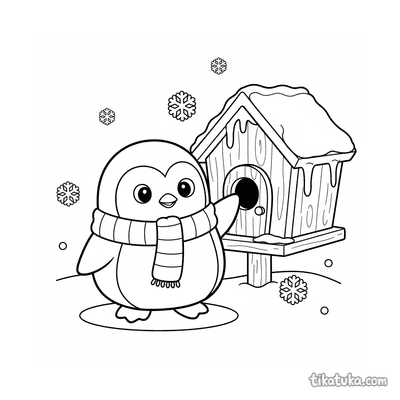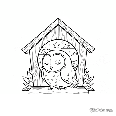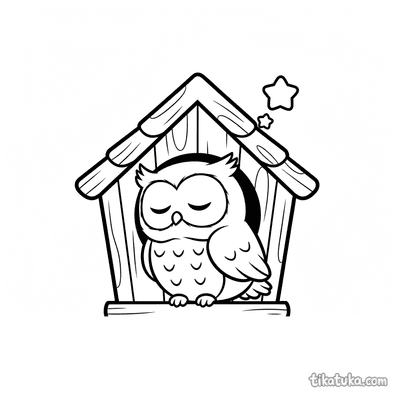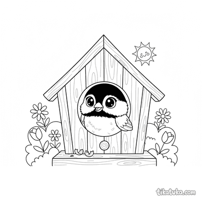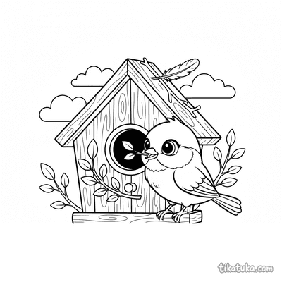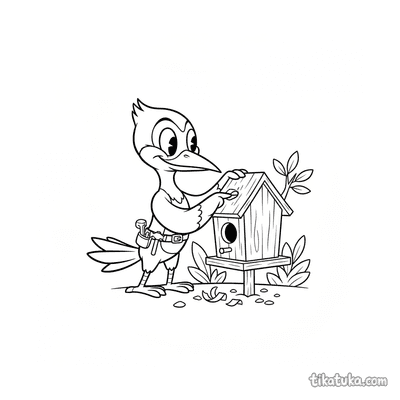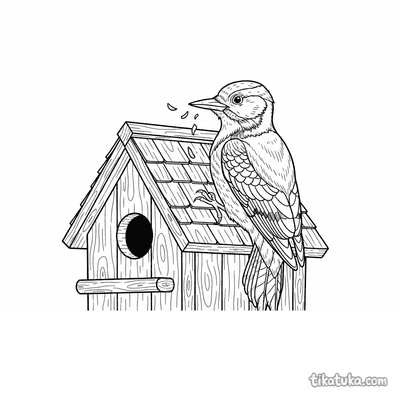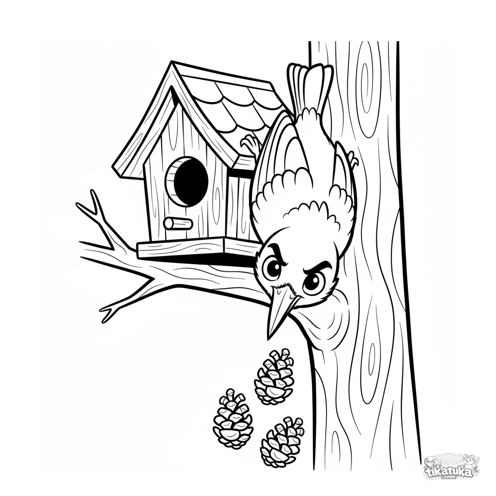 Página para colorir para 7-9 anos: uma trepadeira ágil pendurada de cabeça para baixo no telhado de uma casa de pássaros de madeira. Pose dinâmica, traços expressivos no estilo de quadrinhos.