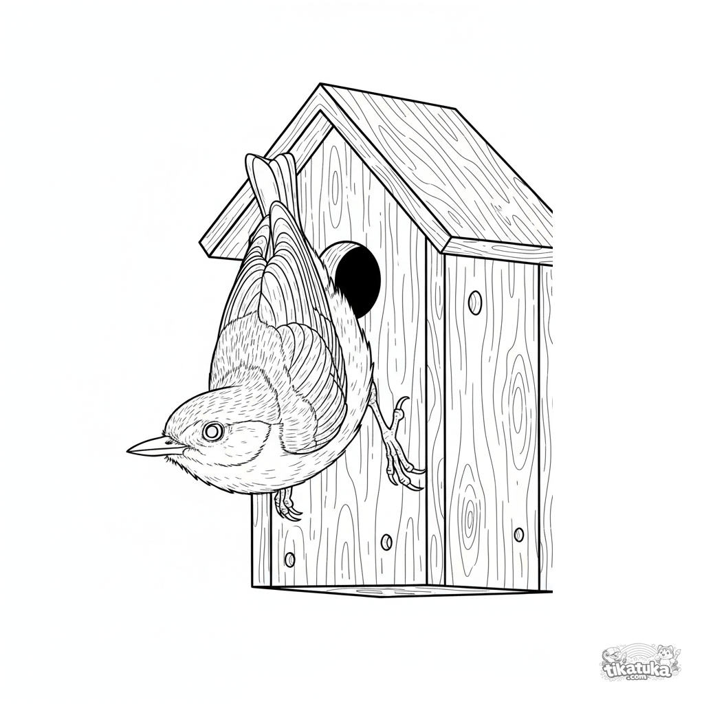 Página para colorir complexa para crianças 10-12: uma trepadeira realiza um feito acrobático, agarrando-se de cabeça para baixo na lateral de uma casa de pássaros de madeira enquanto procura insetos.