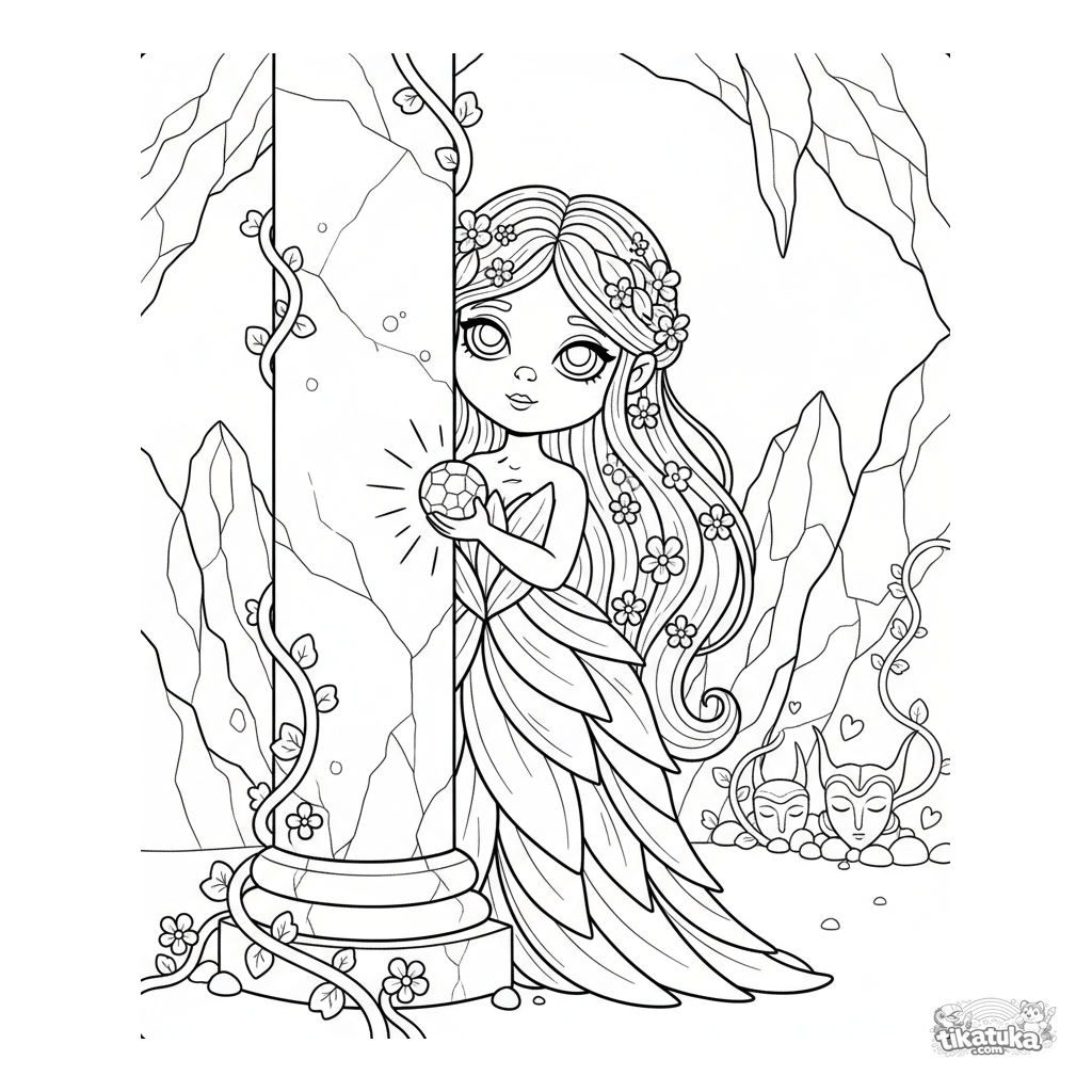 Página para colorir estilo art nouveau para crianças 4-6: uma ninfa tímida com cabelo de folhas espreita atrás de uma coluna no covil da Górgona. Linhas fluidas.