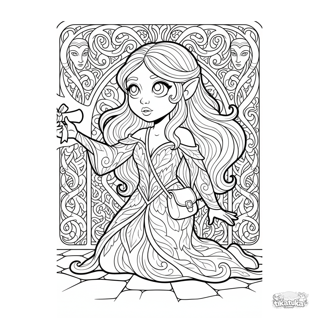 Página para colorir para crianças 7-9: uma ninfa da floresta no covil da Górgona entrega um pergaminho urgente. Cena com detalhes para coloração envolvente.