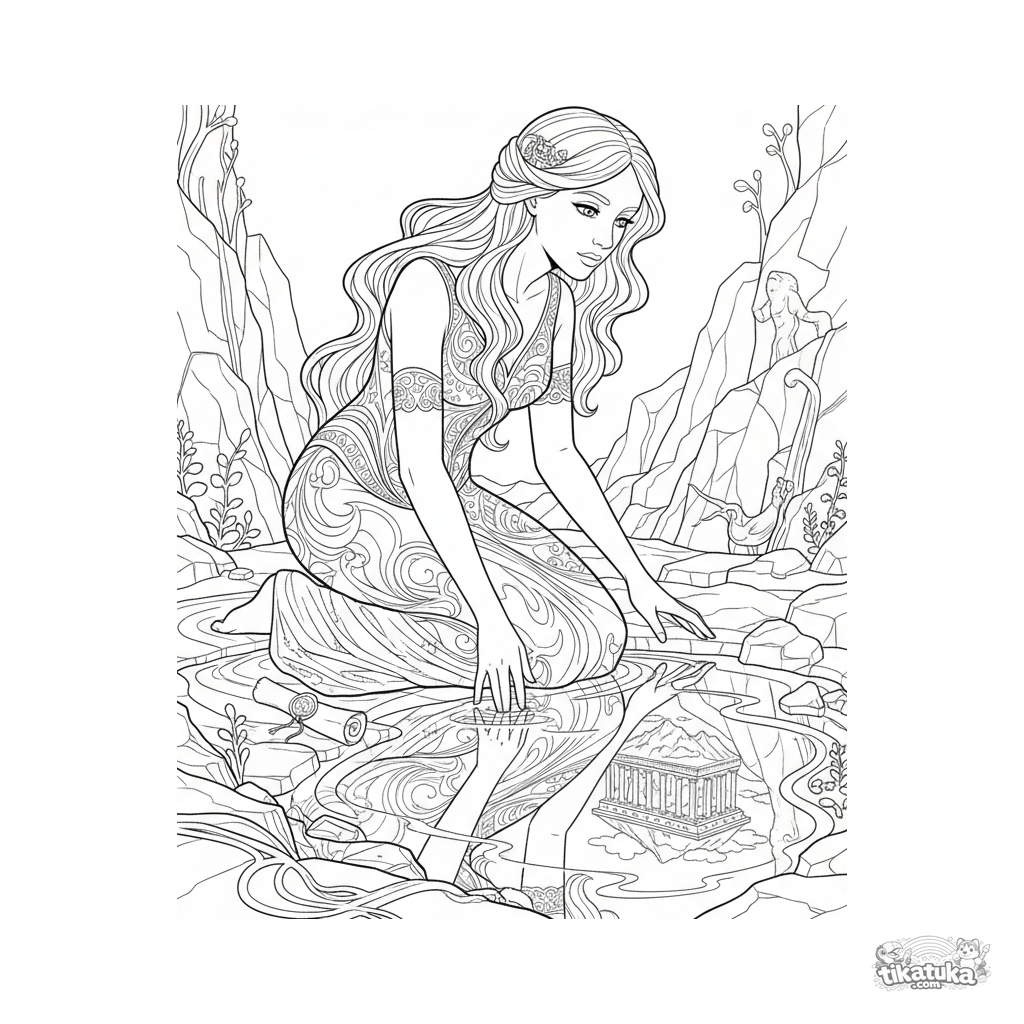 Página para colorir detalhada para crianças 10-12: uma ninfa mensageira ajoelha-se junto a um lago escuro no covil da Górgona.