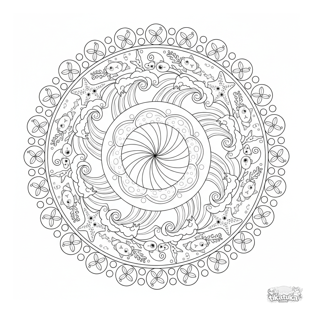 Página para colorir mandala oceânica para 10-12 anos. Centro de concha espiral, anéis de ondas, estrelas-do-mar, cavalos-marinhos, padrão simétrico subaquático.