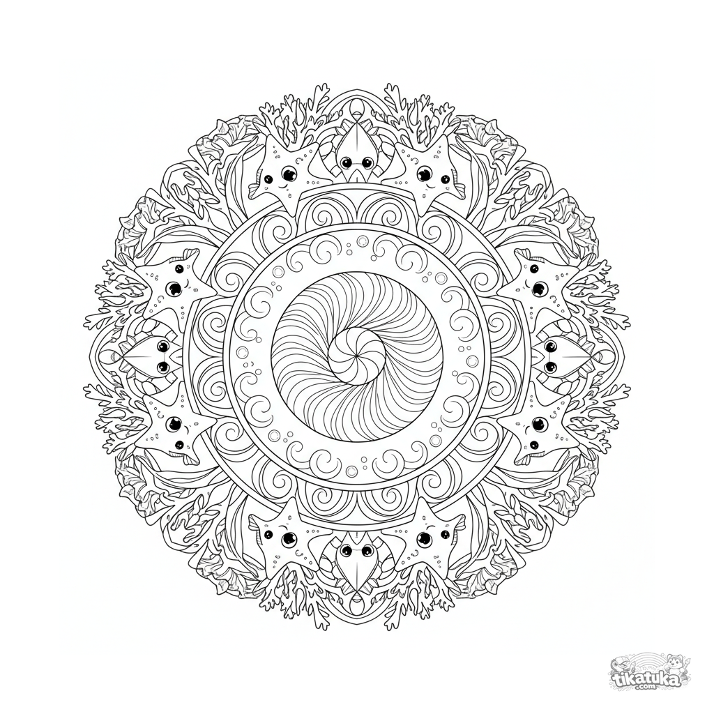 Página para colorir de mandala oceânica detalhada com uma concha, ondas e criaturas marinhas. Padrão complexo para idades 10-12.