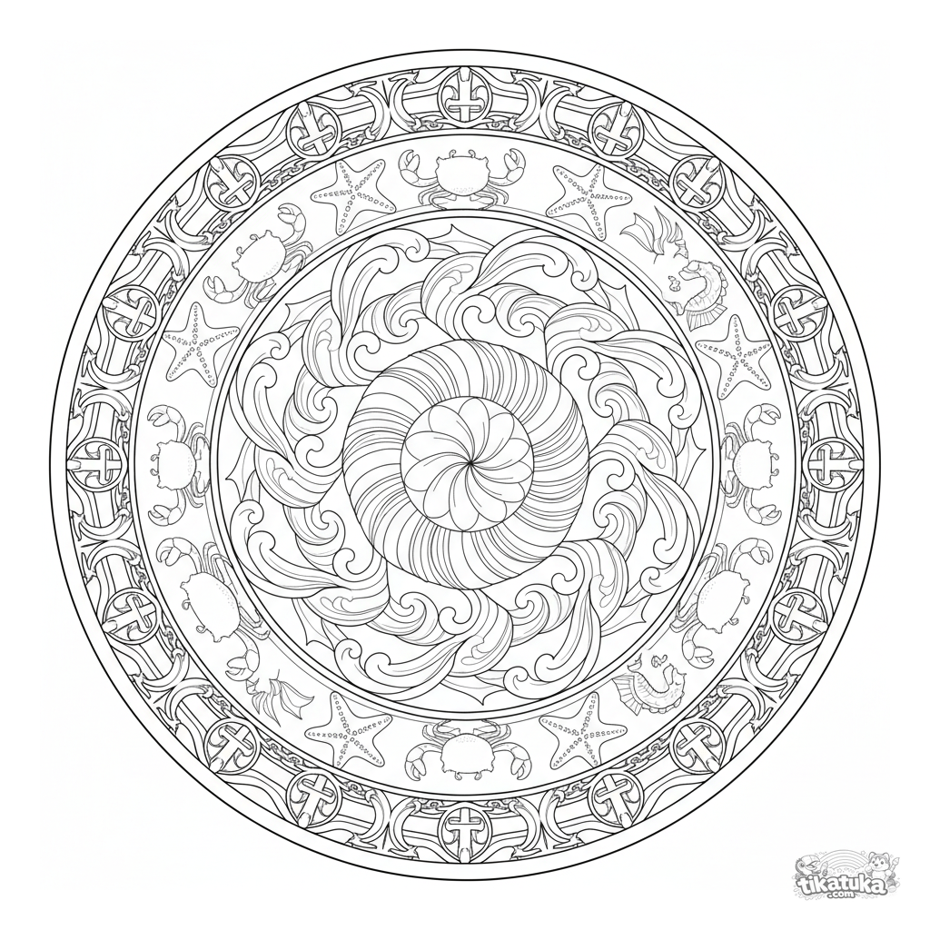 Mandala oceânica detalhada para colorir com concha, ondas e criaturas marinhas. Padrão simétrico intrincado para crianças de 10 a 12 anos.