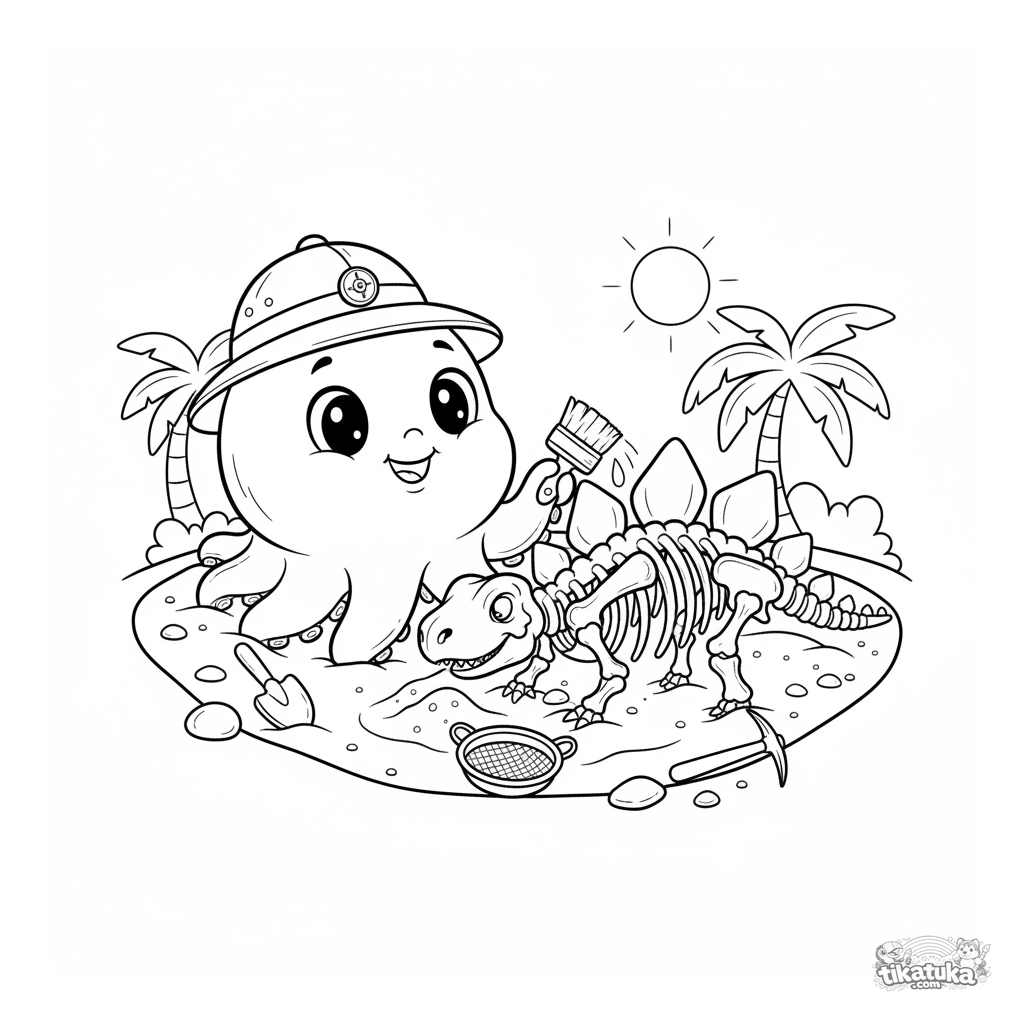 Página para colorir para crianças 4-6: um polvo arqueólogo fofo escova a areia de um fóssil de dinossauro. Linhas simples, estilo brinquedo escandinavo.
