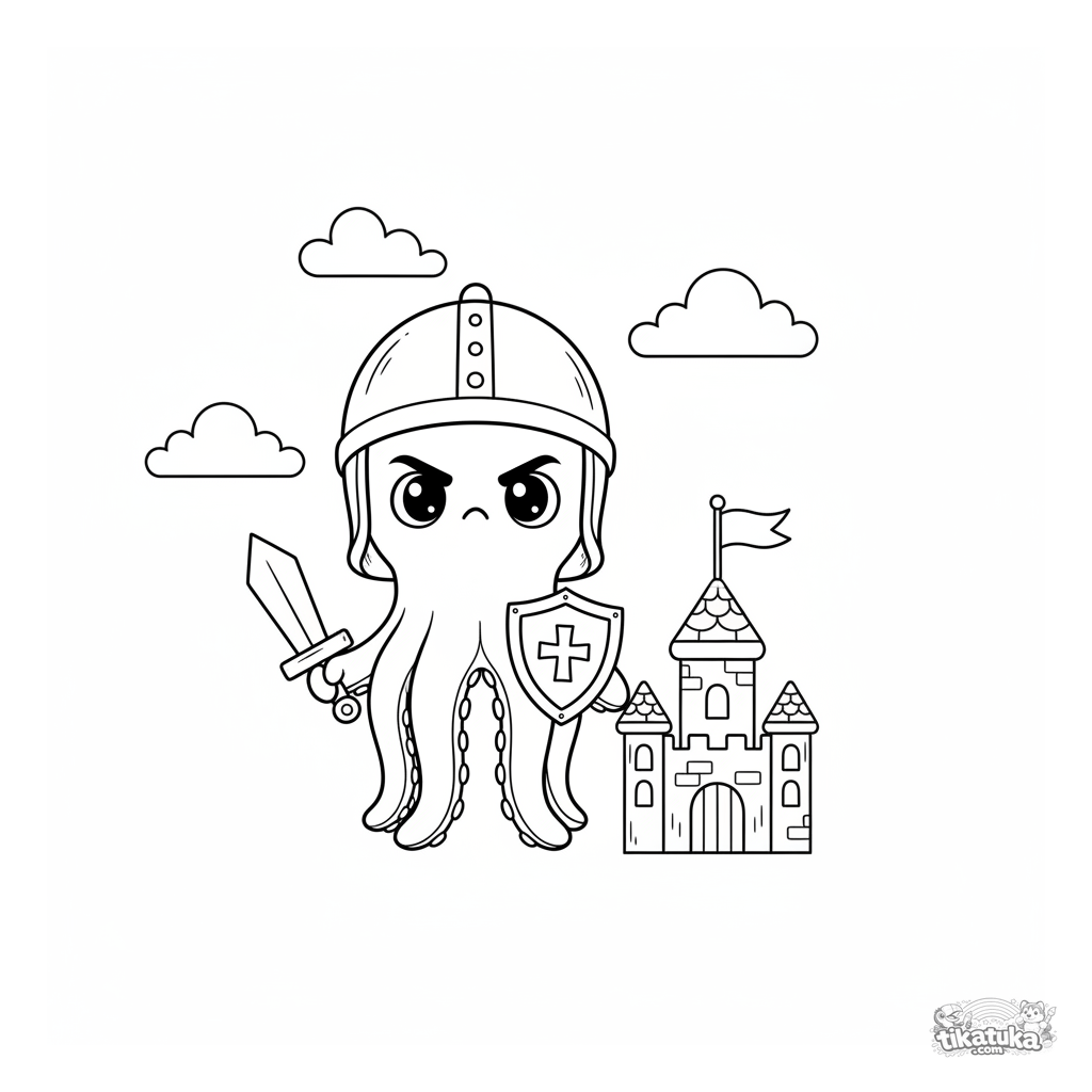 Página para colorir para crianças 4-6: Polvo Bublik como cavaleiro valente guarda um castelo de brinquedo. Formas geométricas, estilo brinquedo de madeira.