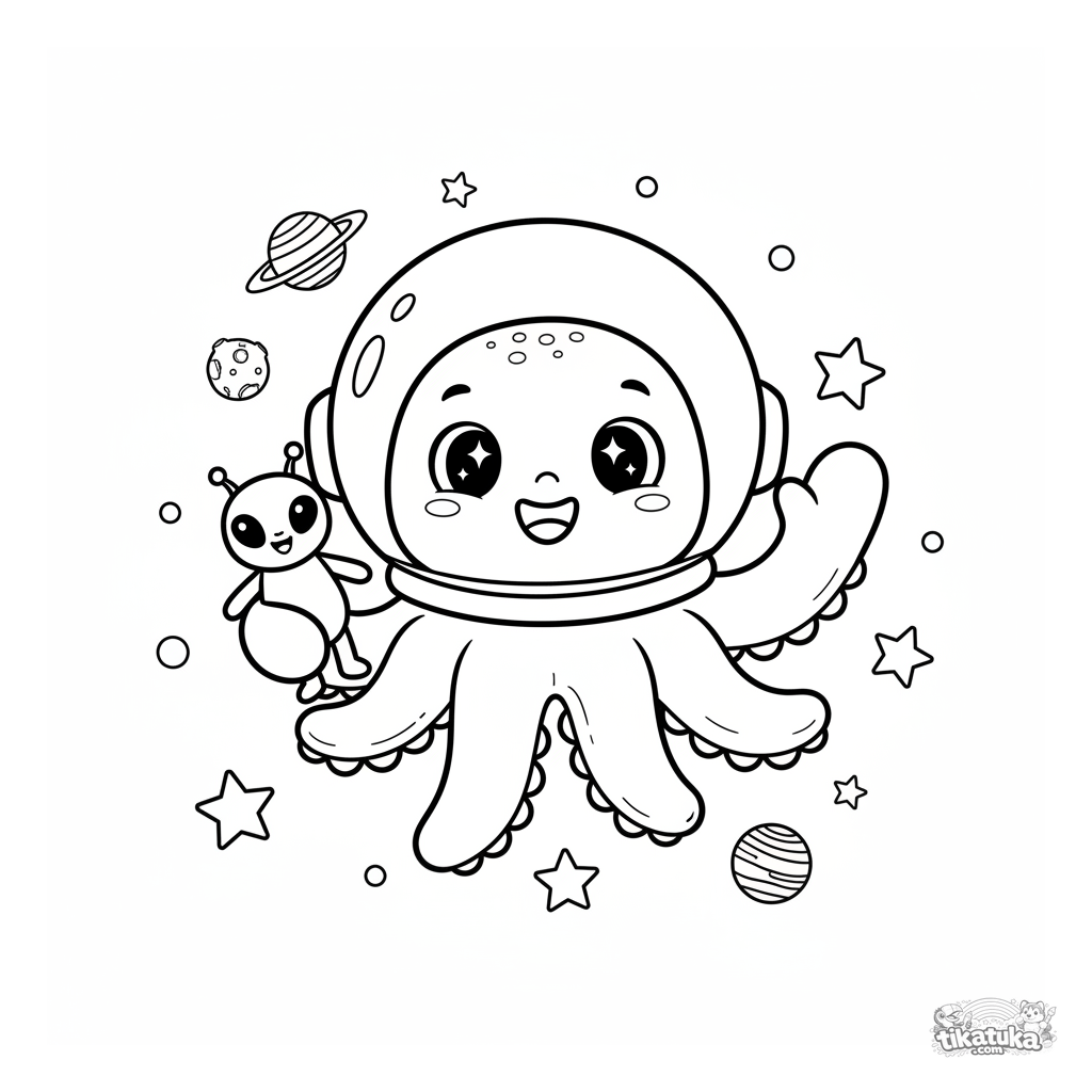 Página para colorir para crianças: um polvo em traje espacial flutua feliz entre planetas e estrelas, conhecendo um amigo alienígena. Estilo mascote de pelúcia.
