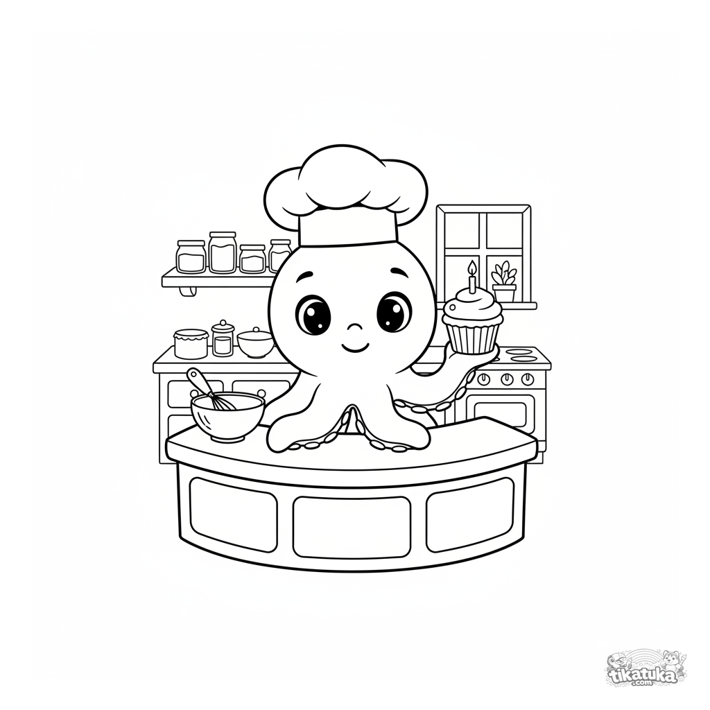Página para colorir para crianças: Polvo Bublik com chapéu de chef prepara um bolinho numa cozinha aconchegante. Detalhes fofos, formas simples.