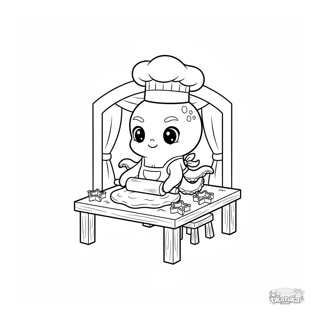 Página para colorir para crianças 4-6: Polvo Bublik com chapéu de chef faz biscoitos. Profissão fofa, formas simples de massa e rolo.