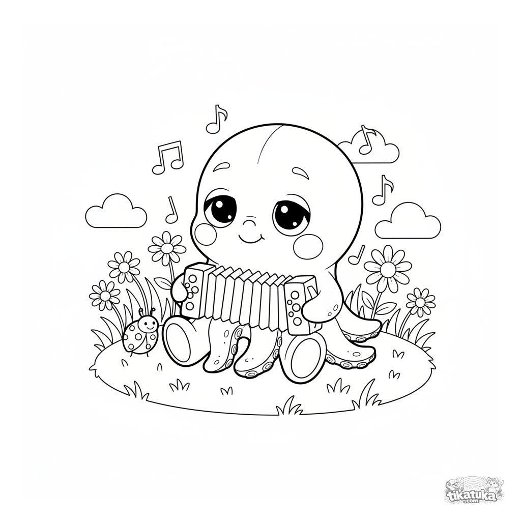 Página para colorir para crianças 4-6: Polvo Bublik toca acordeão em um campo florido. Notas musicais fofas, linhas simples, margens largas.
