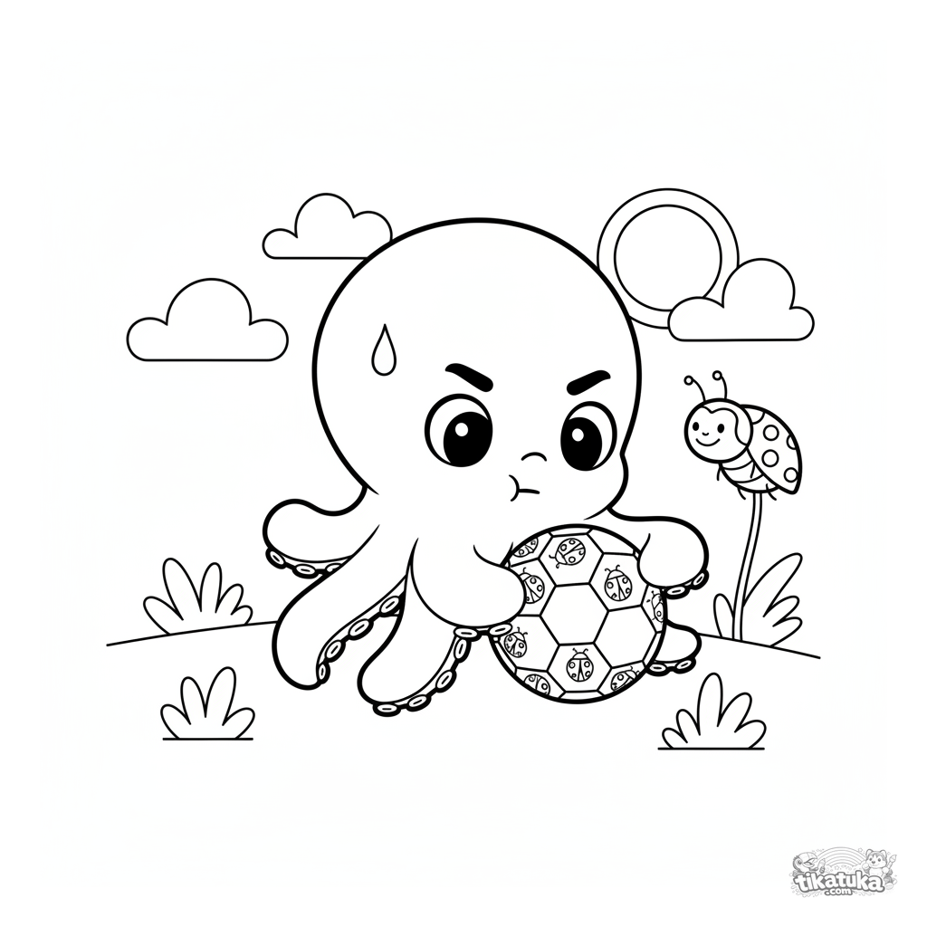Página para colorir de esportes para crianças 4-6: Polvo Bublik dribla uma bola de futebol com padrão de joaninha. Pose dinâmica, estilo de brinquedo de madeira.