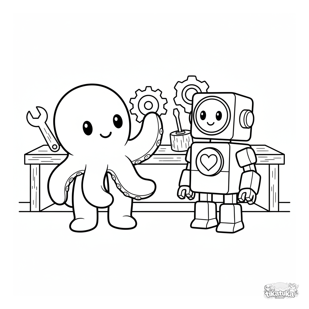 Página para colorir para meninos: Polvo Bublik conhece um robô amigável numa oficina. Contornos limpos, estilo brinquedo escandinavo, para 4-6 anos.