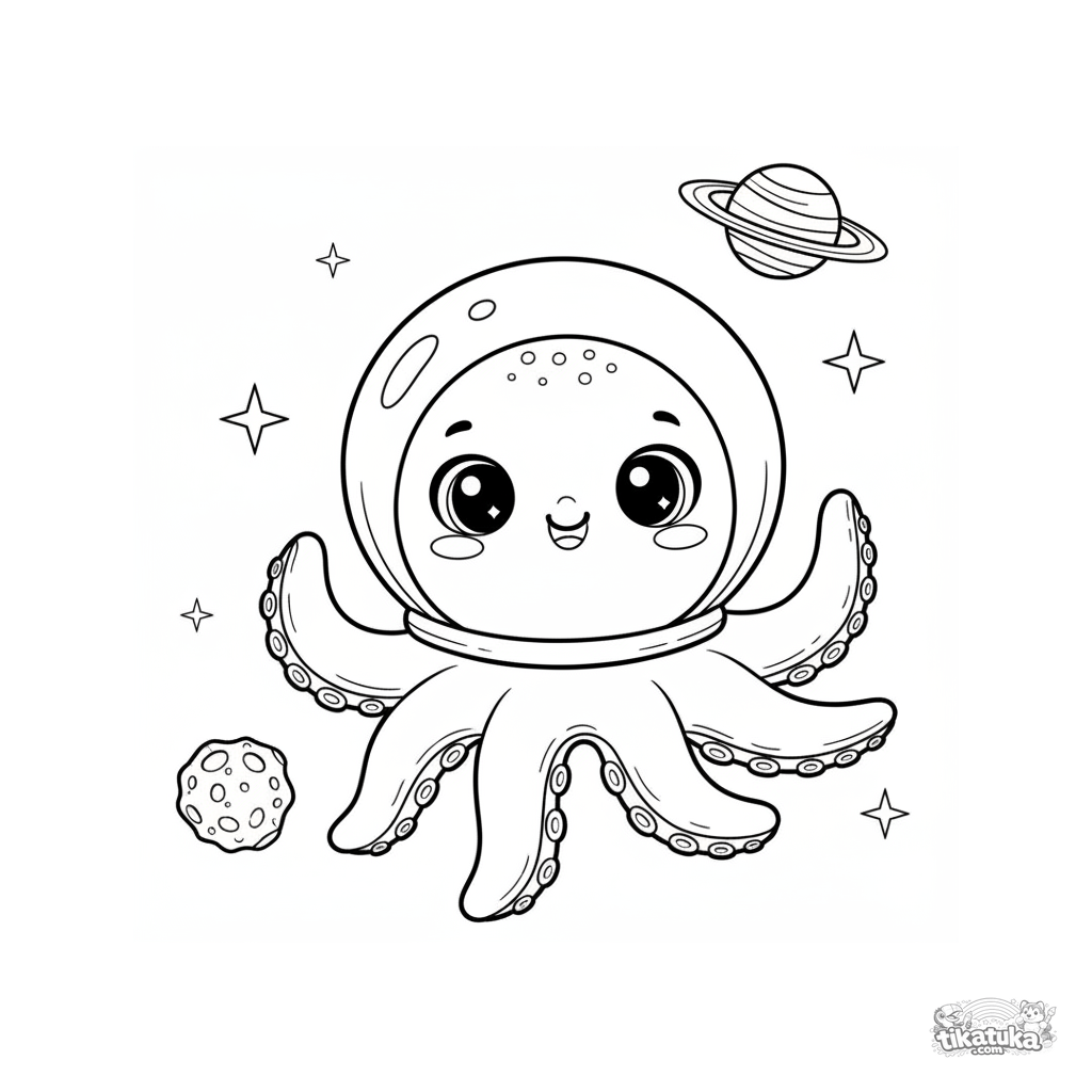 Página para colorir do espaço: Polvo Bublik em traje espacial flutua perto de um asteroide. Linhas simples, muito espaço para colorir, para 4-6 anos.