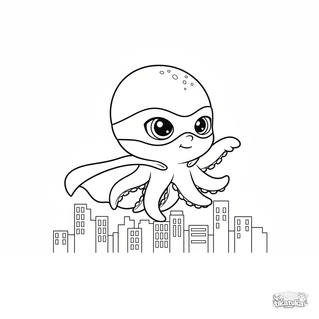 Página para colorir para crianças 4-6: Polvo Bublik com capa de super-herói voa sobre a cidade. Pose dinâmica, silhueta simples do horizonte.