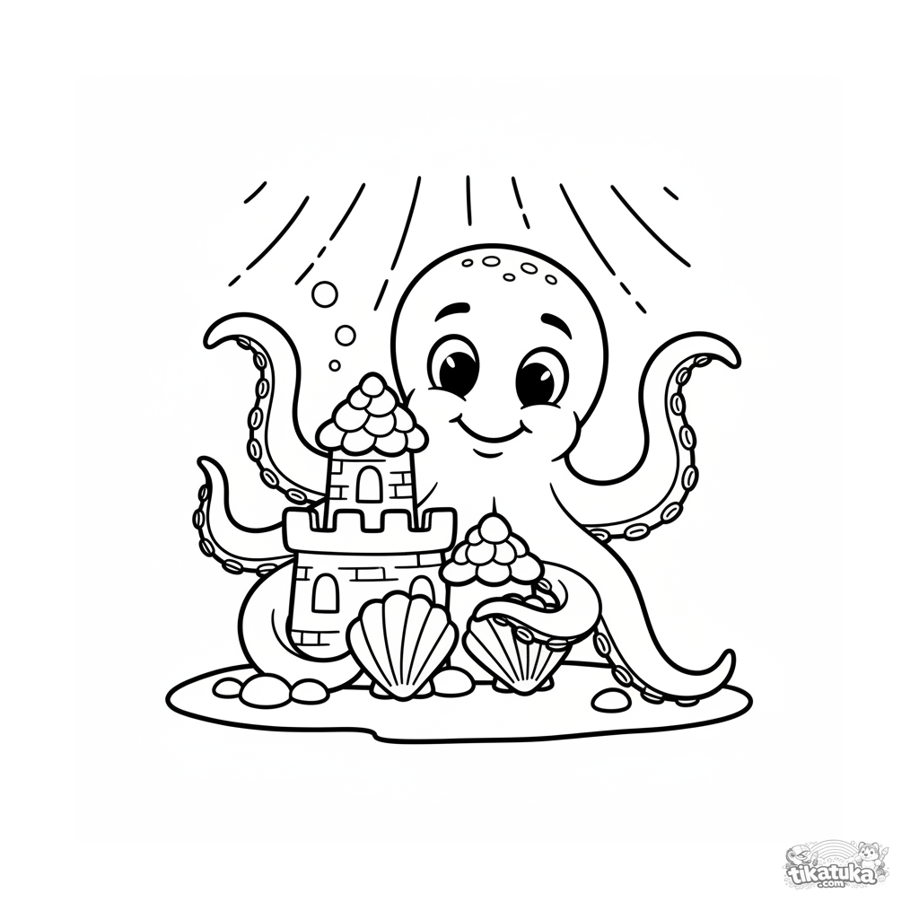 Página para colorir simples de um polvo brincalhão brincando de esconde-esconde em um castelo de conchas. Para crianças pequenas 2-3 anos.