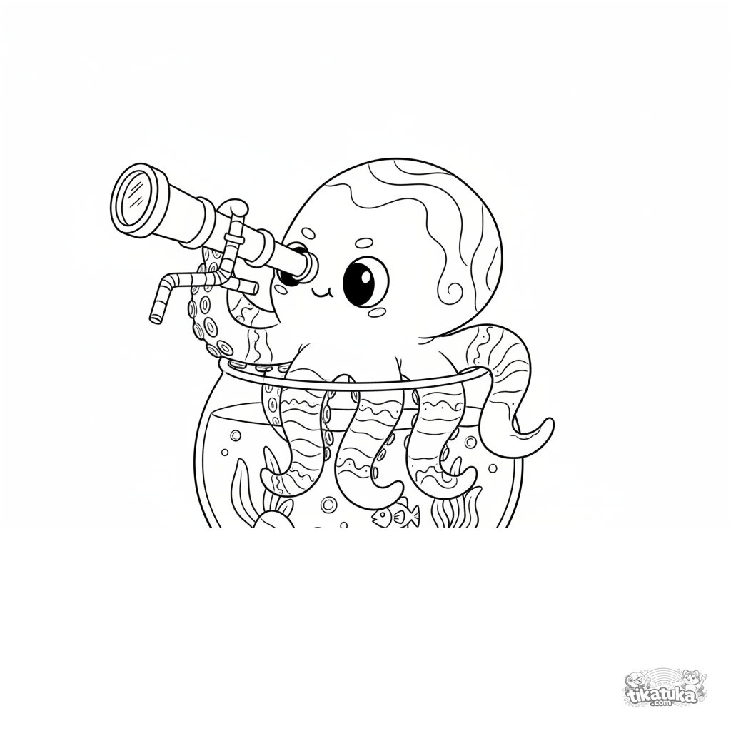 Página para colorir para crianças 10-12: um polvo inventivo no aquário, construindo um periscópio com canudos para espirar uma carteira na mesa. Cena de rabisco engraçada e detalhada.