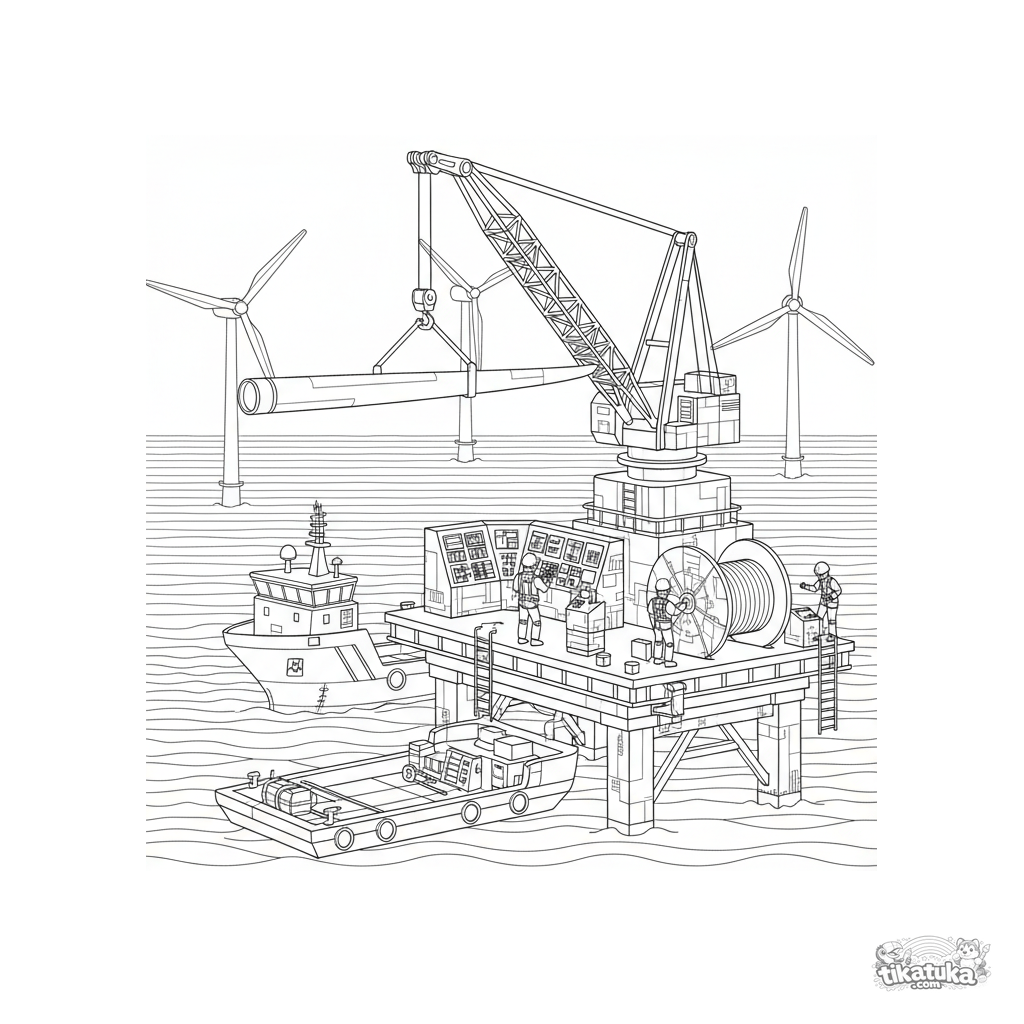 Página para colorir para 10-12 anos: plataforma industrial de manutenção para parques eólicos offshore. Técnicos, equipamentos, guindaste e navio de serviço. Cena técnica detalhada no mar.