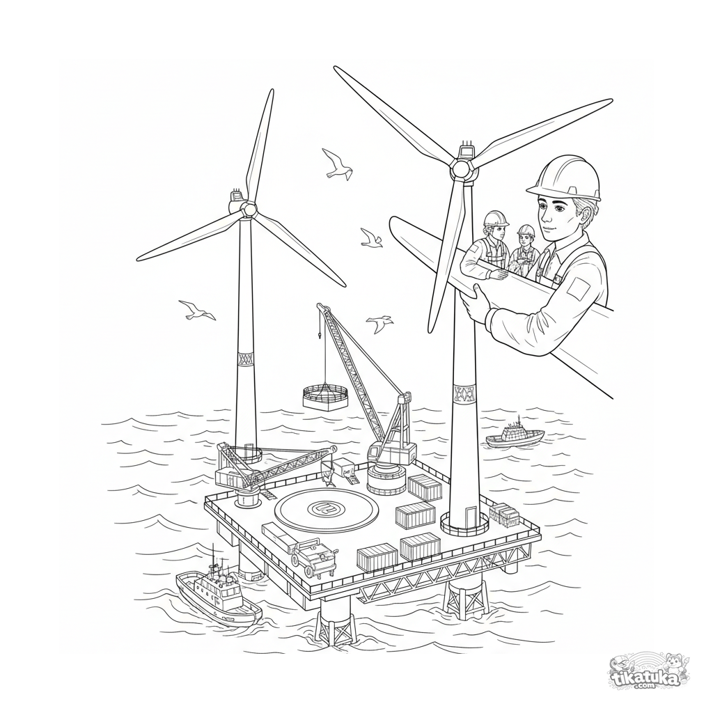 Página para colorir para 10-12 anos: uma plataforma de manutenção industrial detalhada para parques eólicos offshore. Engenheiros, guindastes, helicóptero e mar agitado.