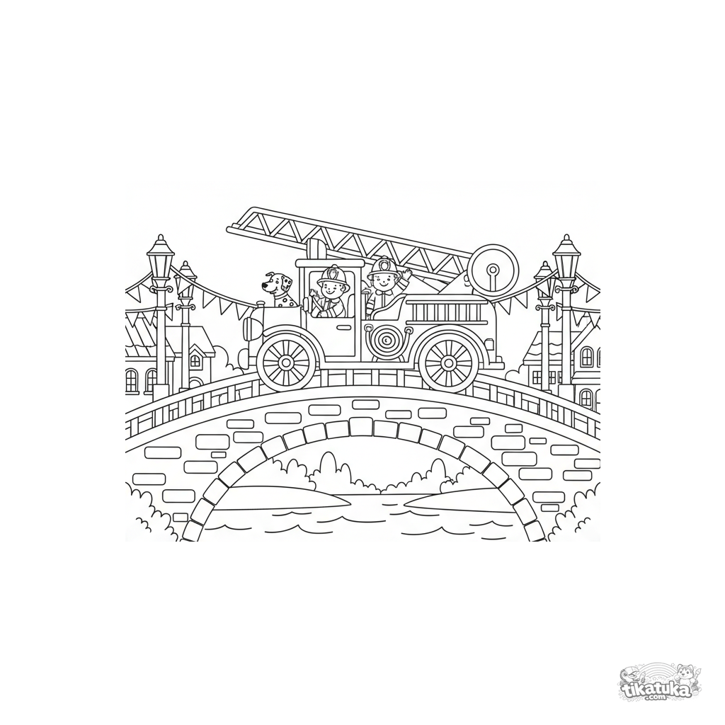 Página para colorir para meninos de 7-9 anos: um carro de bombeiros antigo participa de um desfile festivo em uma ponte decorada sobre um rio. Estilo livro de histórias aconchegante, detalhes históricos, atmosfera amigável.