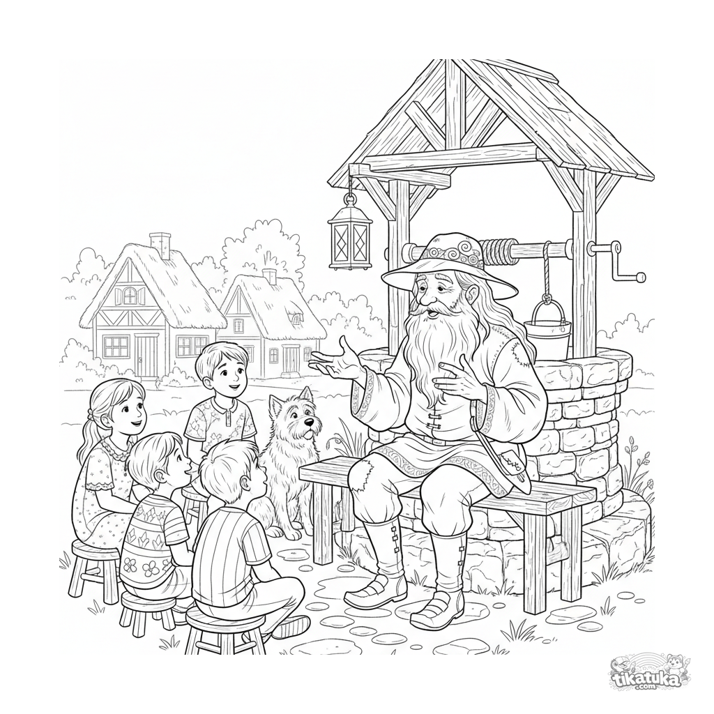 Página para colorir para crianças mais velhas 10-12: um velho contador de histórias reconta um conto sobre água viva no poço da vila. Cena detalhada em estilo de gravura vintage com crianças e um cachorro.