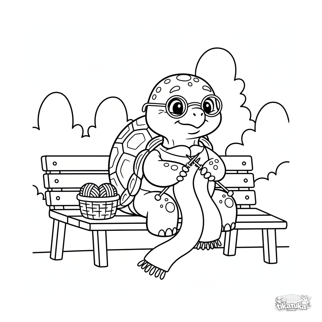 Página para colorir para crianças pequenas 2-3: uma tartaruga grande e amigável tricotando um cachecol num banco de parque. Formas simples, margens amplas.