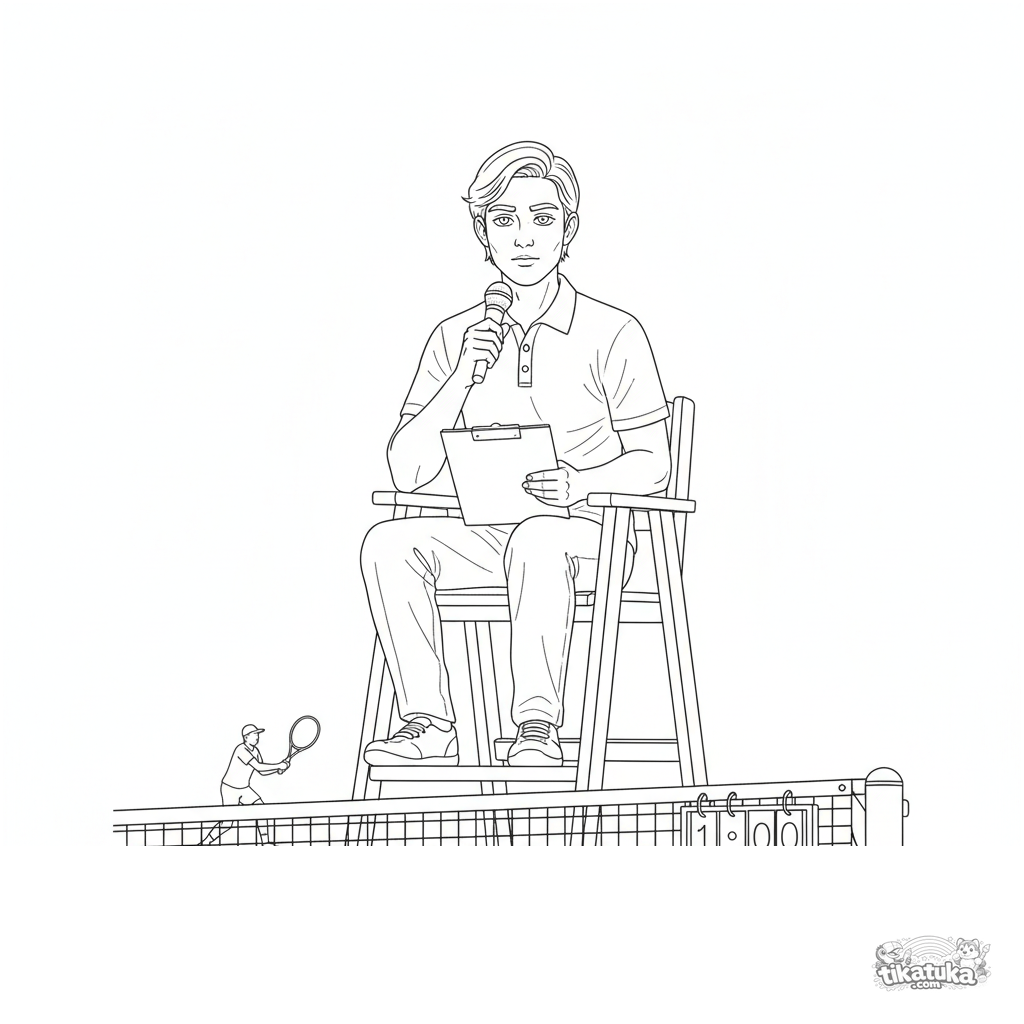 Página para colorir detalhada para crianças de 10-12 anos: um árbitro observa a partida da cadeira alta em uma quadra de tênis. Proporções realistas, elementos do uniforme, perspectiva.