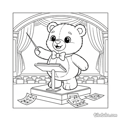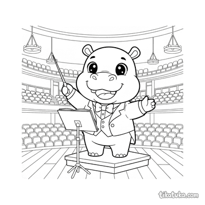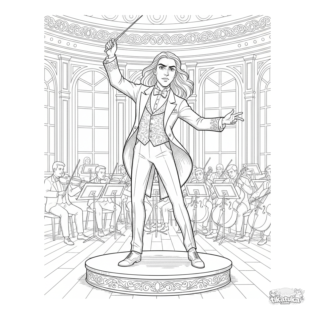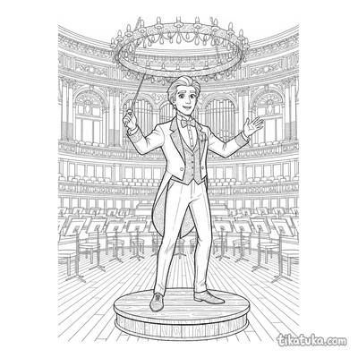 Página para colorir para crianças maiores de 10-12 anos: um maestro no clímax de uma peça num palco de sala de concertos. Alto nível de detalhe.