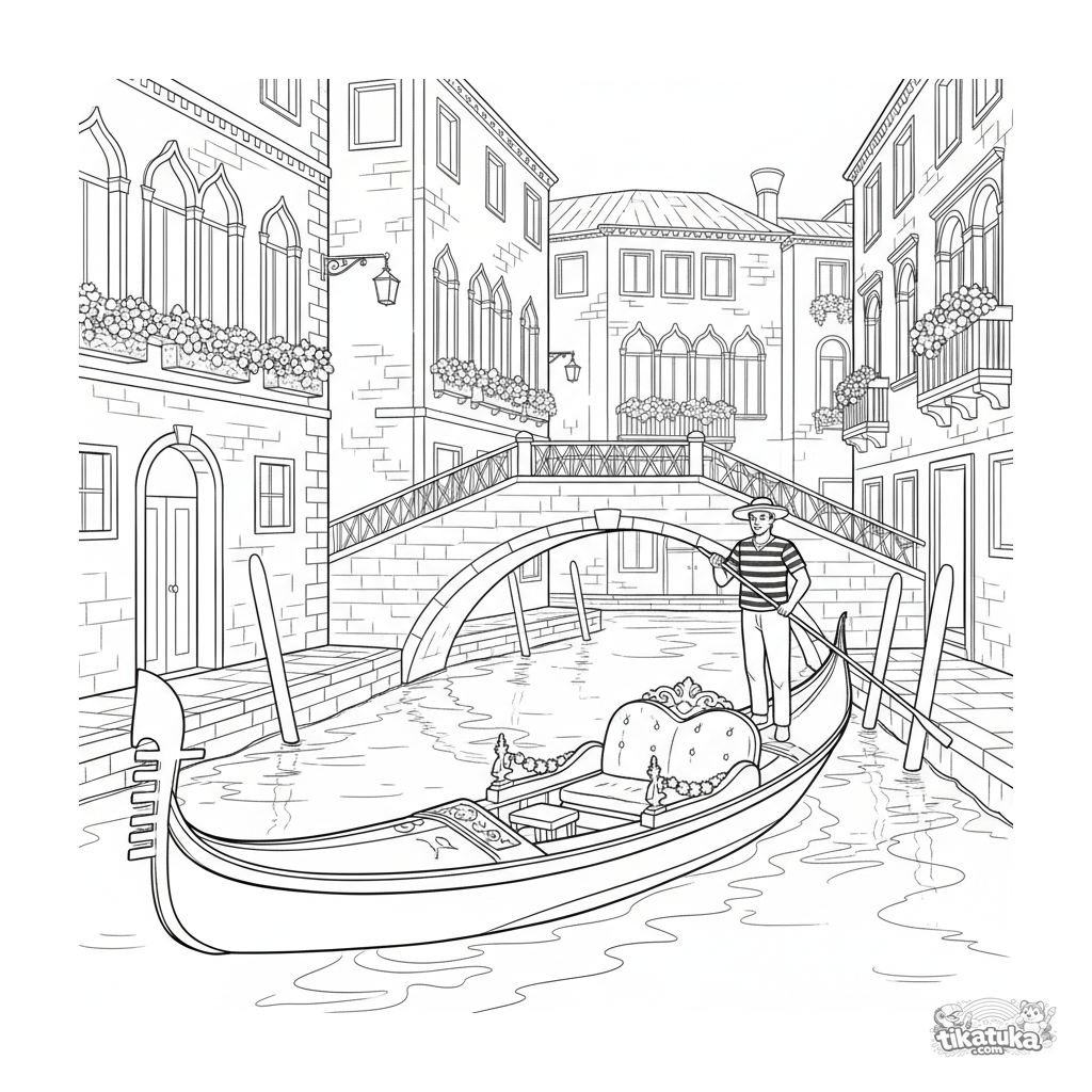 Página para colorir para crianças de 7-9 anos: uma gôndola veneziana detalhada sob uma ponte em arco. Cena com detalhes arquitetônicos.