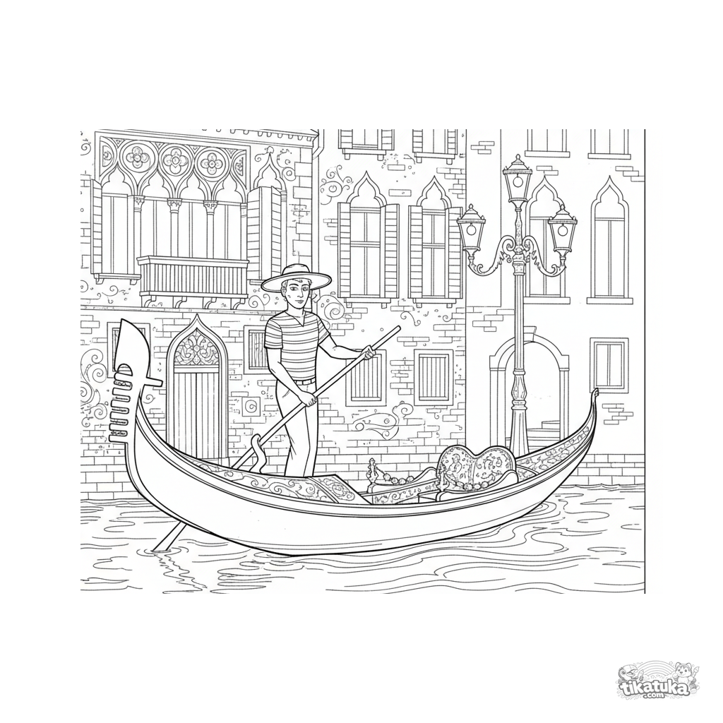 Página para colorir detalhada para crianças mais velhas 10-12: uma gôndola veneziana ornamentada desliza por um canal ao pôr do sol. Reflexos na água, arquitetura e clima exigem atenção aos detalhes ao colorir.