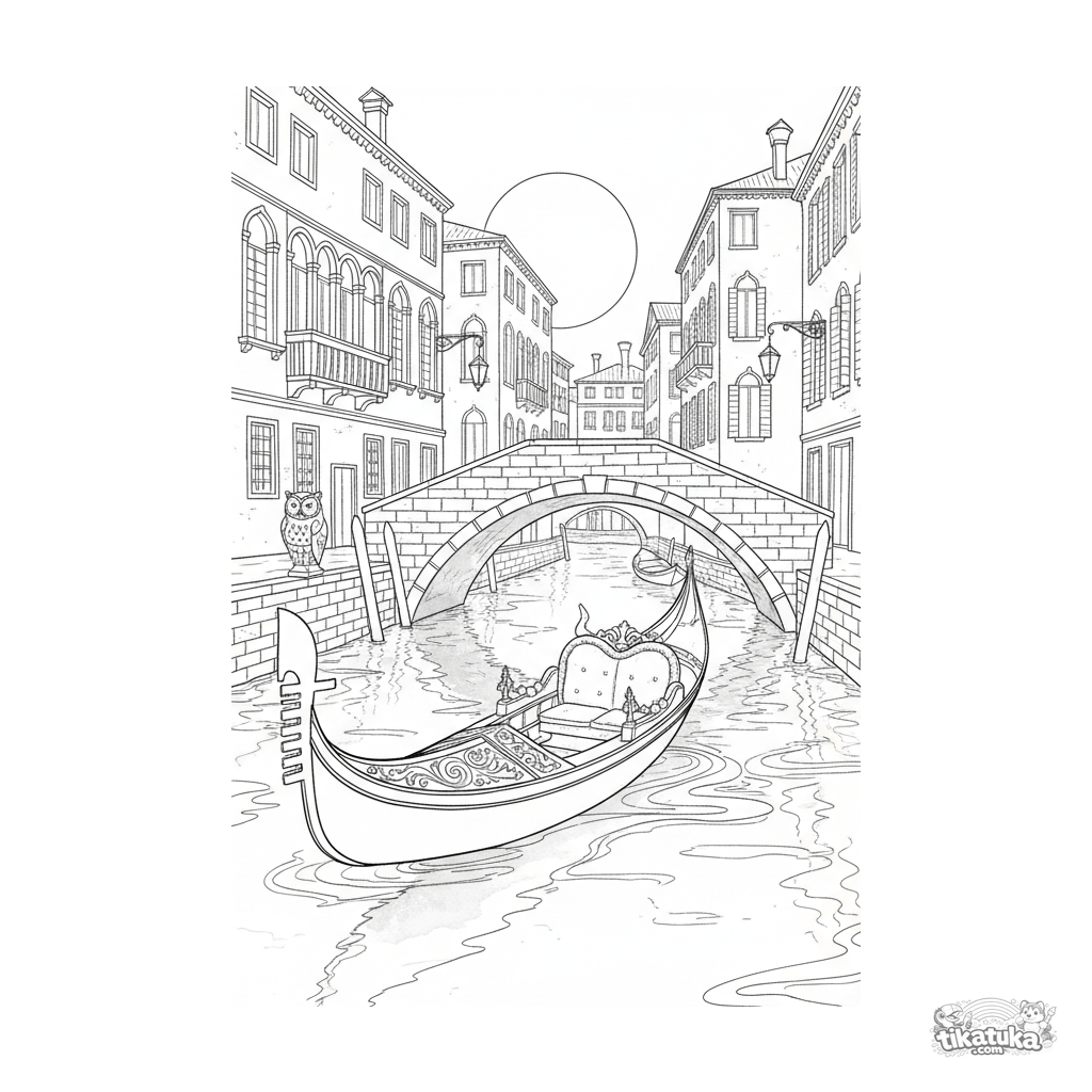 Página para colorir detalhada para crianças mais velhas 10-12: uma gôndola veneziana ornamentada desliza em um canal noturno sob uma ponte. Reflexos de lanternas, arquitetura e clima misterioso.