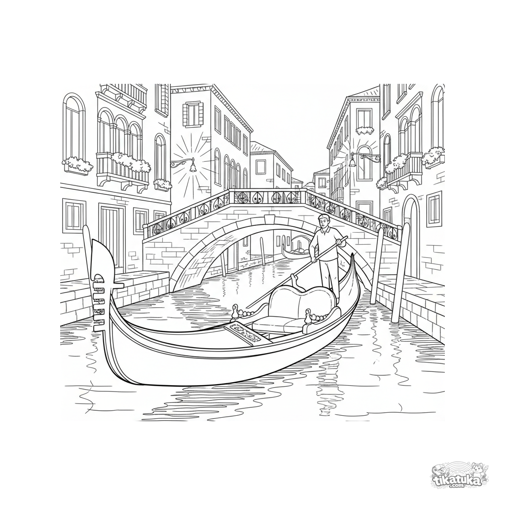 Página para colorir para pré-adolescentes de 7 a 9 anos: uma gôndola veneziana detalhada desliza sob uma ponte de pedra ao anoitecer. Cena urbana aconchegante.