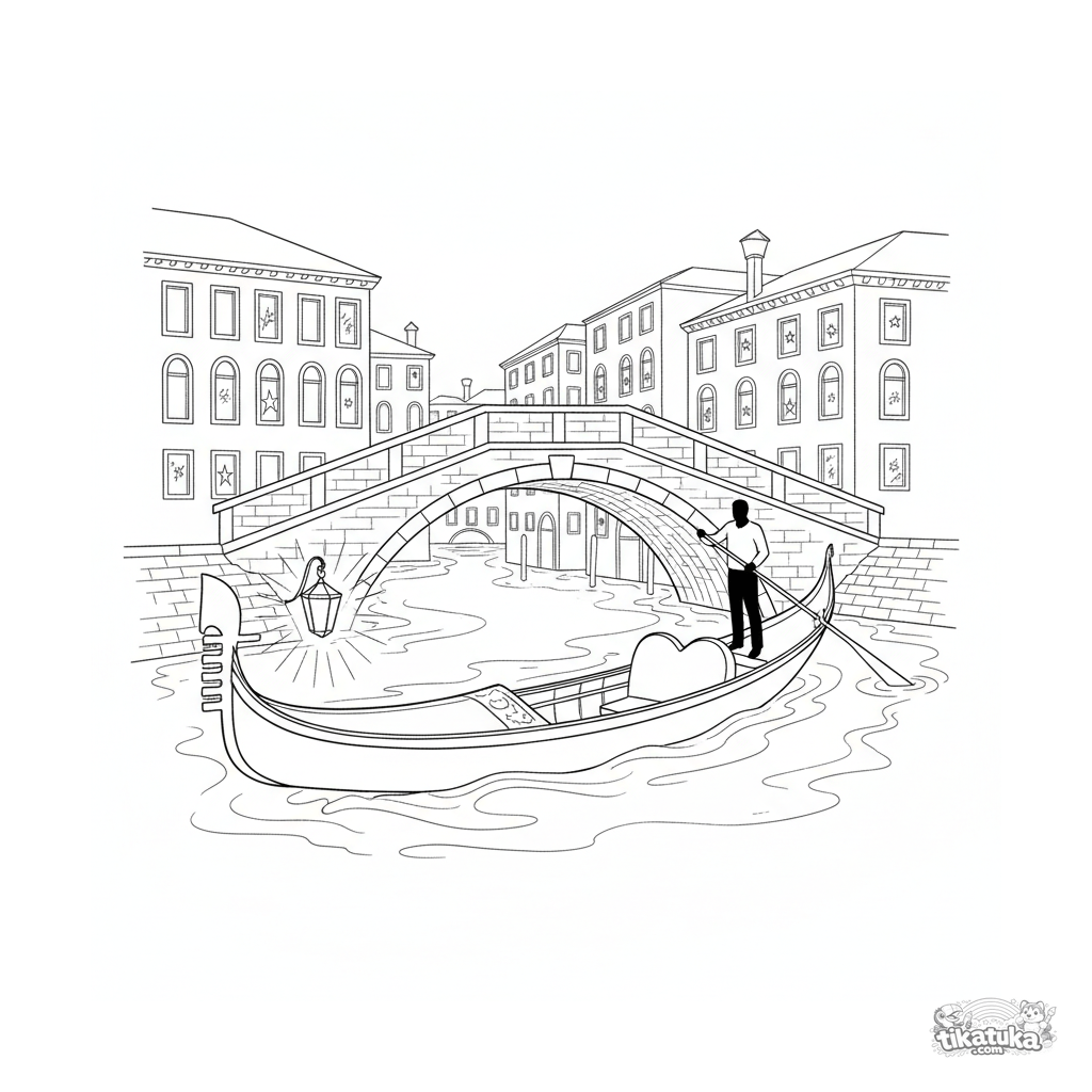 Página para colorir para pré-adolescentes de 7 a 9 anos: uma gôndola veneziana detalhada com uma lanterna desliza sob uma ponte de pedra ao anoitecer.