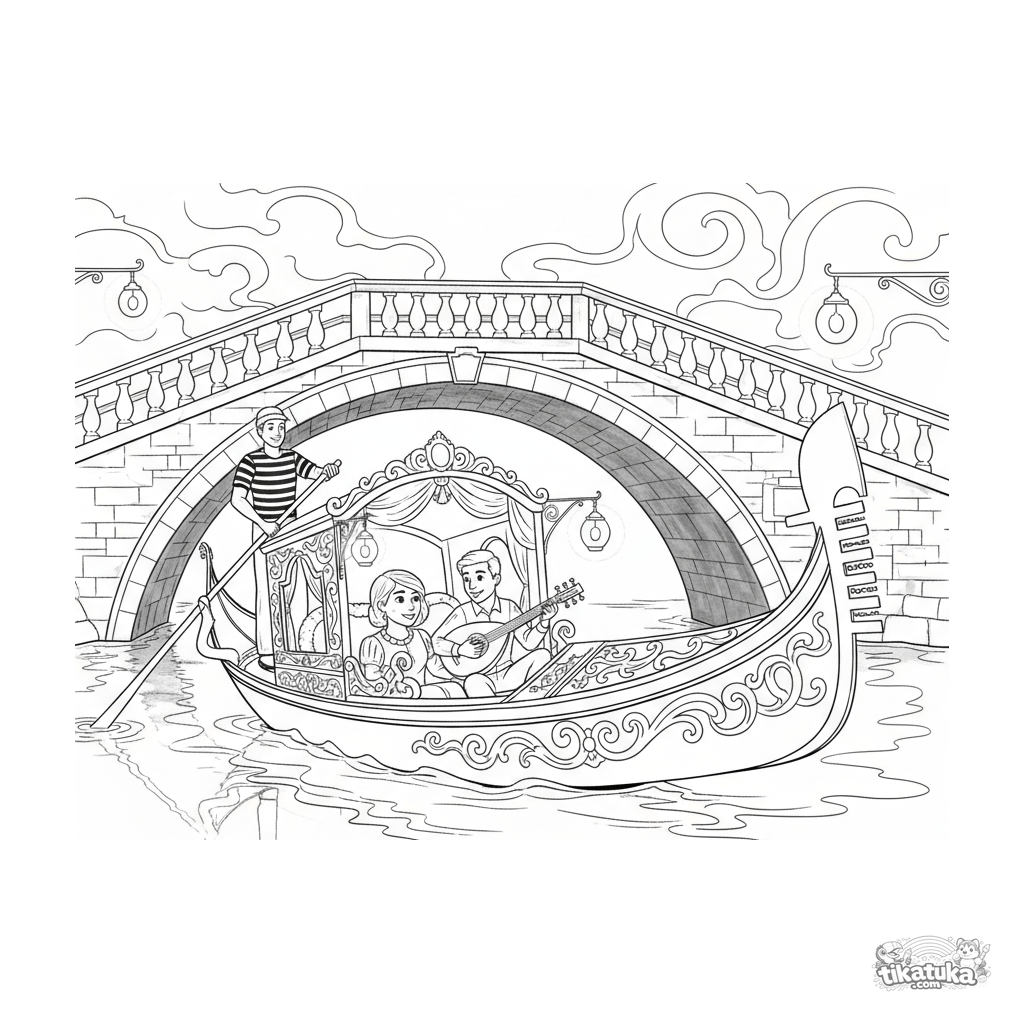 Página para colorir detalhada para crianças mais velhas de 10-12 anos: uma gôndola veneziana ornamentada com um músico desliza sob uma ponte ao anoitecer.