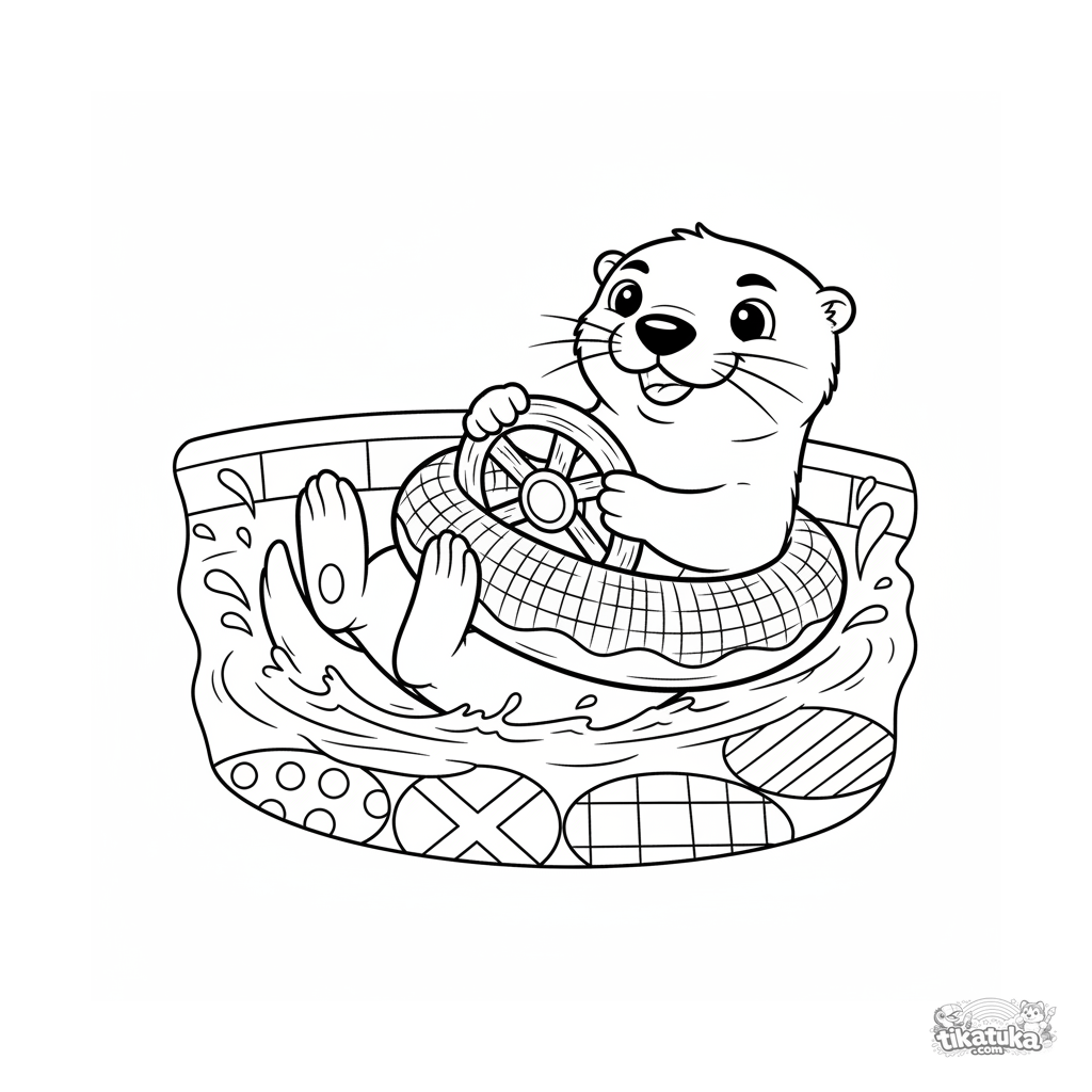 Página para colorir para crianças 7-9: uma lontra travessa nada de costas, girando uma boia na superfície da piscina. Cena dinâmica e divertida com traços expressivos.