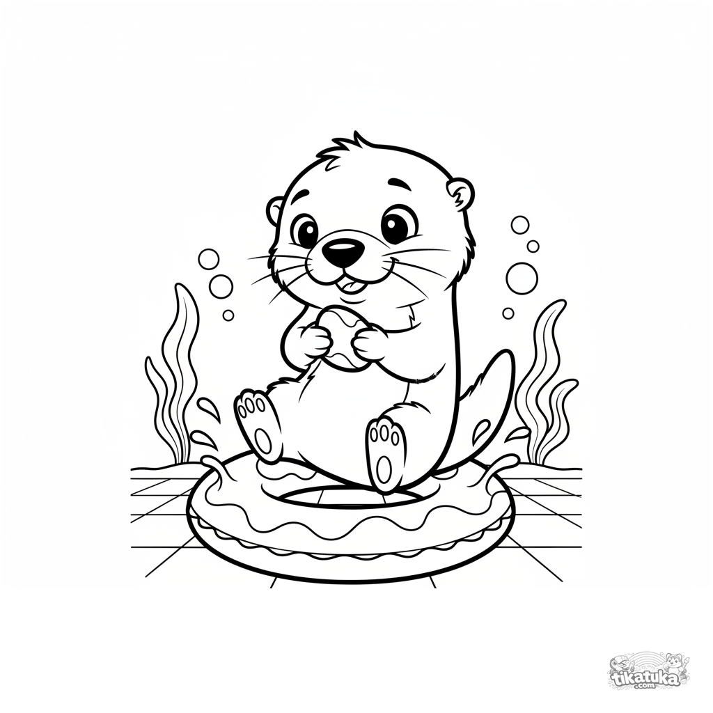 Página para colorir para crianças de 7-9 anos: um fofo filhote de lontra tenta se equilibrar em pé em um anel inflável no fundo da piscina.