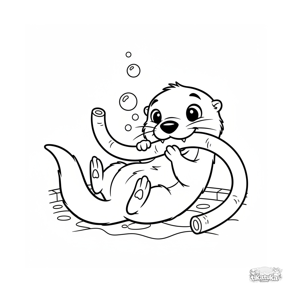 Página para colorir para crianças de 4-6 anos: um alegre filhote de lontra brinca com um noodle no fundo da piscina. Pose expressiva, estilo clássico de desenho animado da Disney, emoções positivas.
