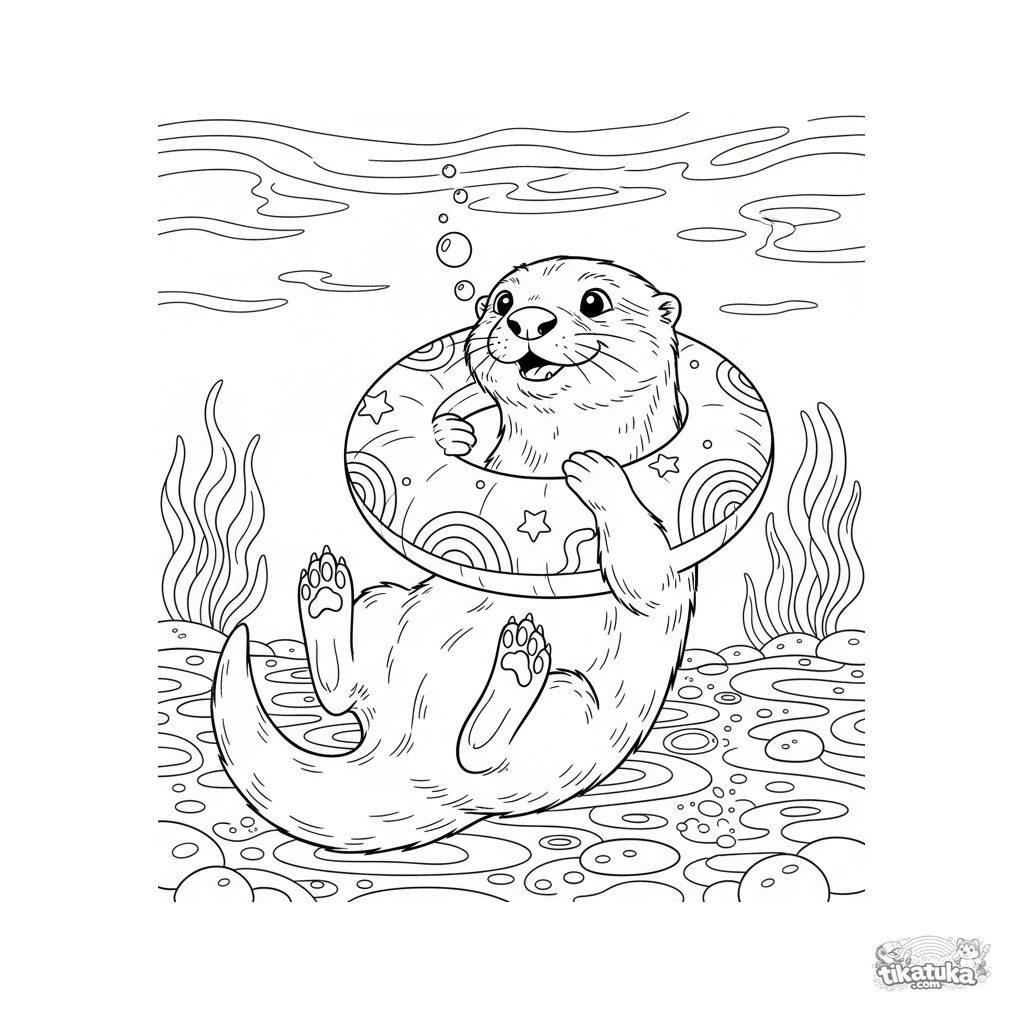 Página para colorir detalhada para crianças de 10-12 anos: um filhote de lontra brinca no fundo segurando uma boia acima. Proporções realistas, pose expressiva.