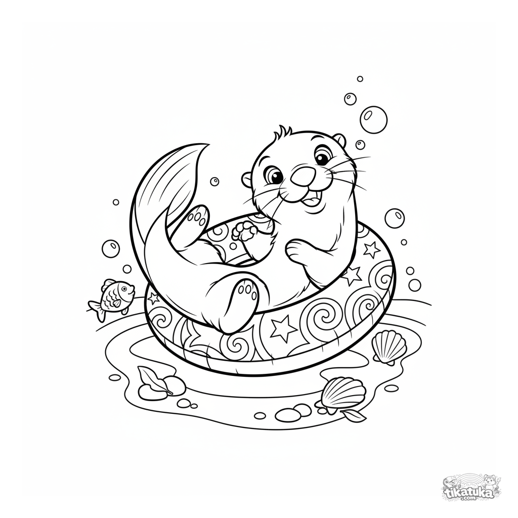 Página dinâmica para colorir de um filhote de lontra brincando com um anel inflável no fundo da piscina. Para crianças mais velhas de 10 a 12 anos.