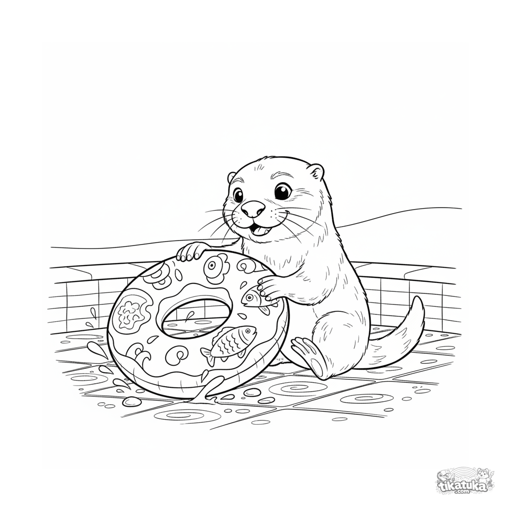 Página detalhada para colorir para crianças de 10-12 anos: uma lontra brincalhona rola um anel inflável no fundo da piscina. Cena com textura, movimento e emoção expressiva.