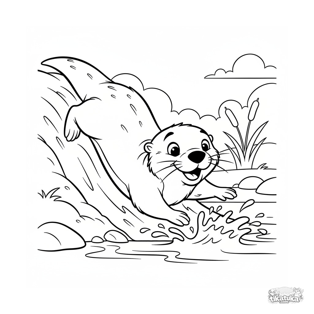 Página para colorir para crianças de 4-6 anos: uma lontra feliz deslizando pela margem em um riacho. Cena dinâmica e fofa.