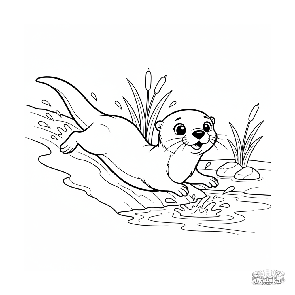 Página para colorir para pré-adolescentes 7-9: uma lontra alegre desliza por uma margem lamacenta para dentro de um riacho claro. Pose dinâmica, estilo de quadrinhos.