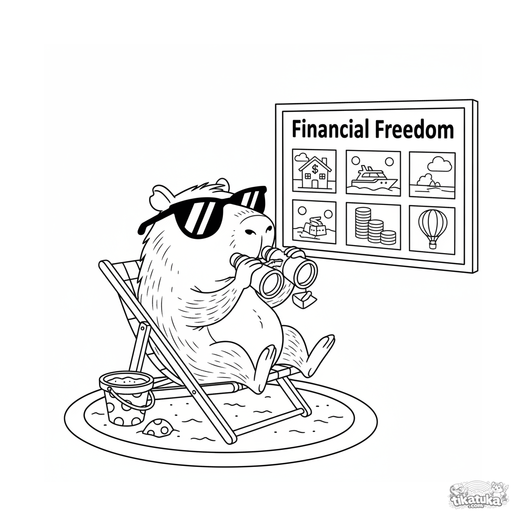 Página para colorir para crianças 10-12: uma capivara confiante com óculos de sol e binóculos numa praia improvisada, sonhando com liberdade financeira.