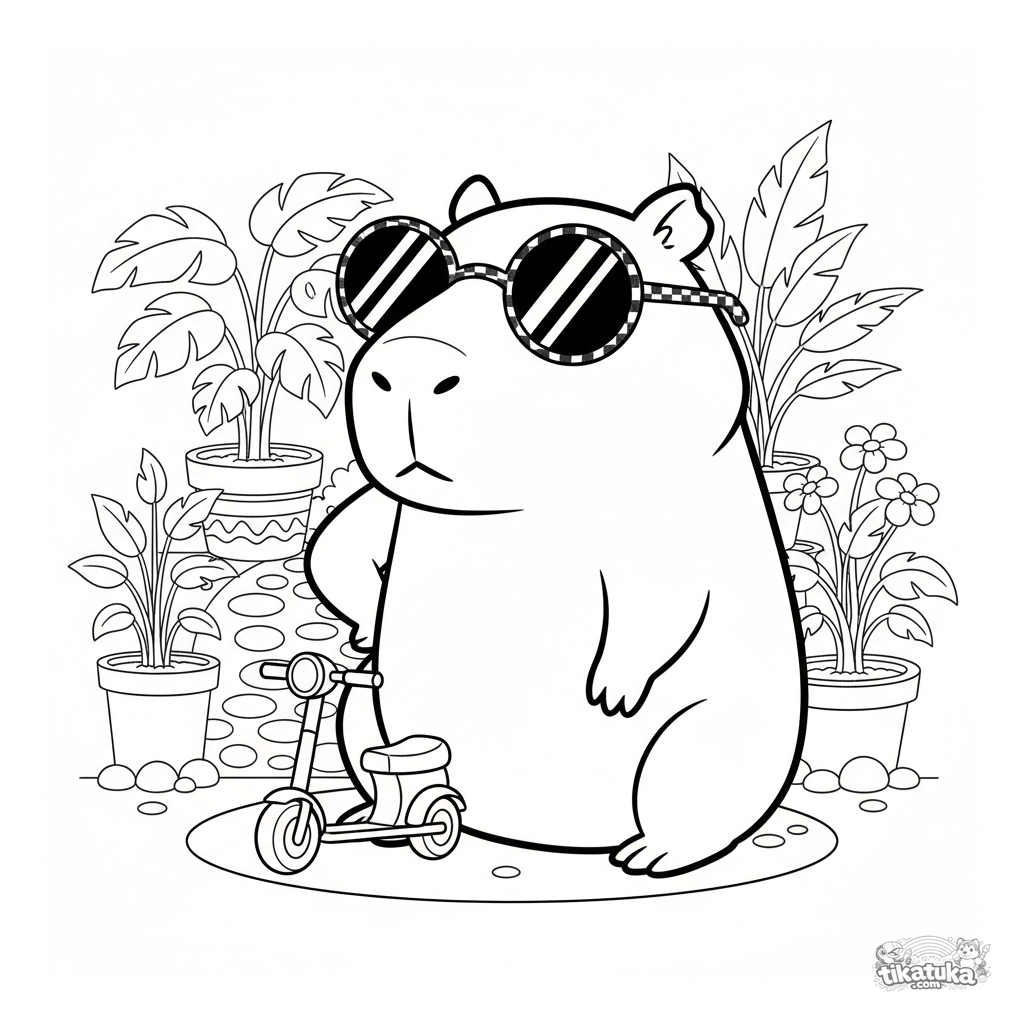 Página para colorir para crianças 7-12: uma capivara enorme e confiante demais com óculos de sol posa orgulhosamente ao lado de um patinete minúsculo. Cena absurda e engraçada no estilo de memes da internet.